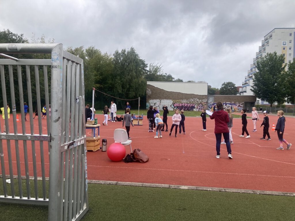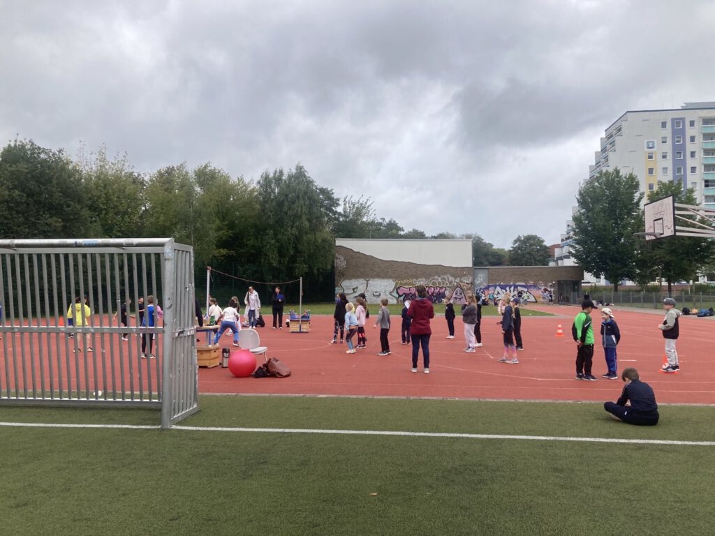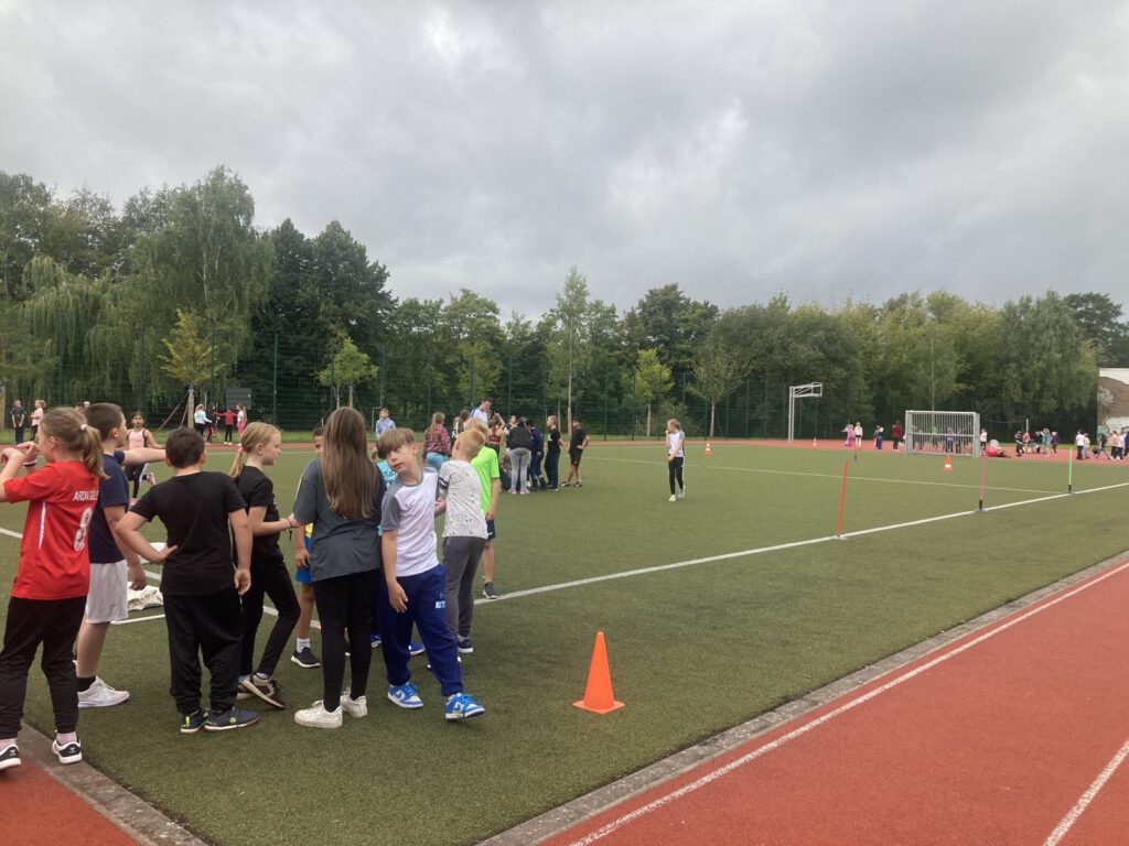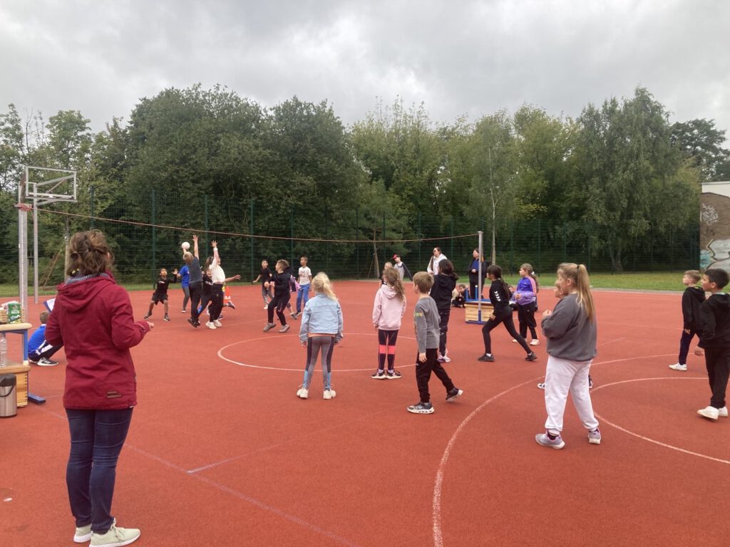 Auch in diesem Schuljahr starteten wir wieder sportlich mit unserem Ballsportfest. Nach der Erwärmung rund um den Sportplatz gab es noch viele erwärmende Sportübungen durch unsere Sportlehrer und die Kinder machten die Bewegungen mit Freude nach. Anschließend ging es für die Klassen zwei bis vier mit den Ballspielen Fußball, Zweifelderball, Ball über die Schnur und Brennball los. Auch unsere Ersties kamen zum Zuschauen und staunten. Die Jahrgangsstufen zeigten bei den Wettkämpfen vollen Eifer, aber auch Spaß, Teamgeist und Fairness. Dabei erbrachten die Kinder auch tolle Ergebnisse die wir bei der anschließenden Siegerehrung feierten.