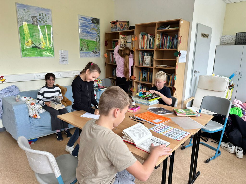 Sie ist immer in der zweiten Hofpause geöffnet und lädt alle Kinder herzlich dazu ein, vorbeizukommen, zu stöbern und in die Welt der Geschichten einzutauchen.