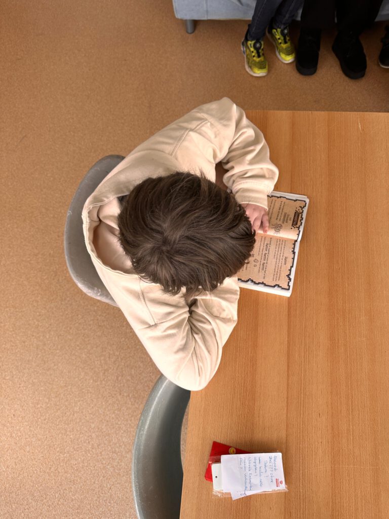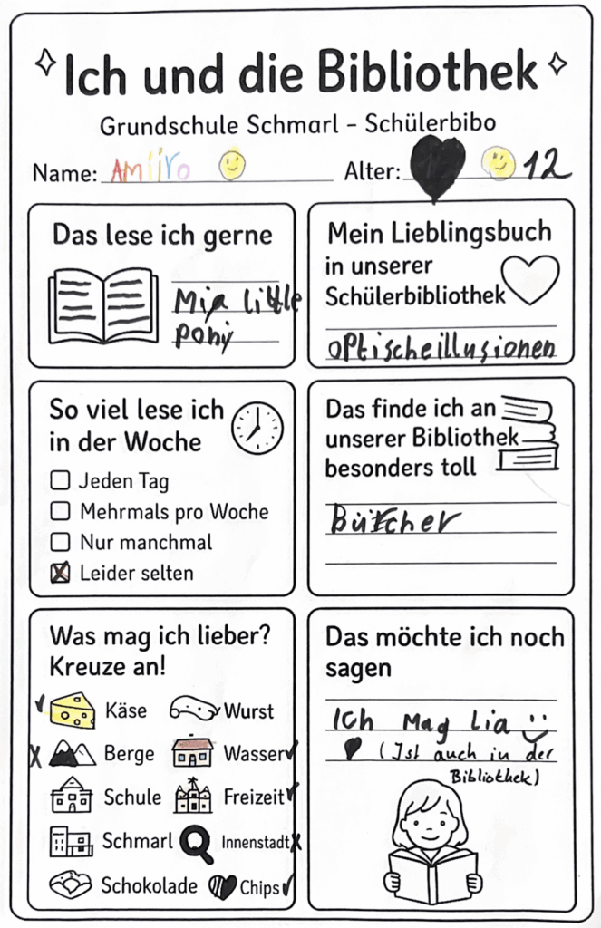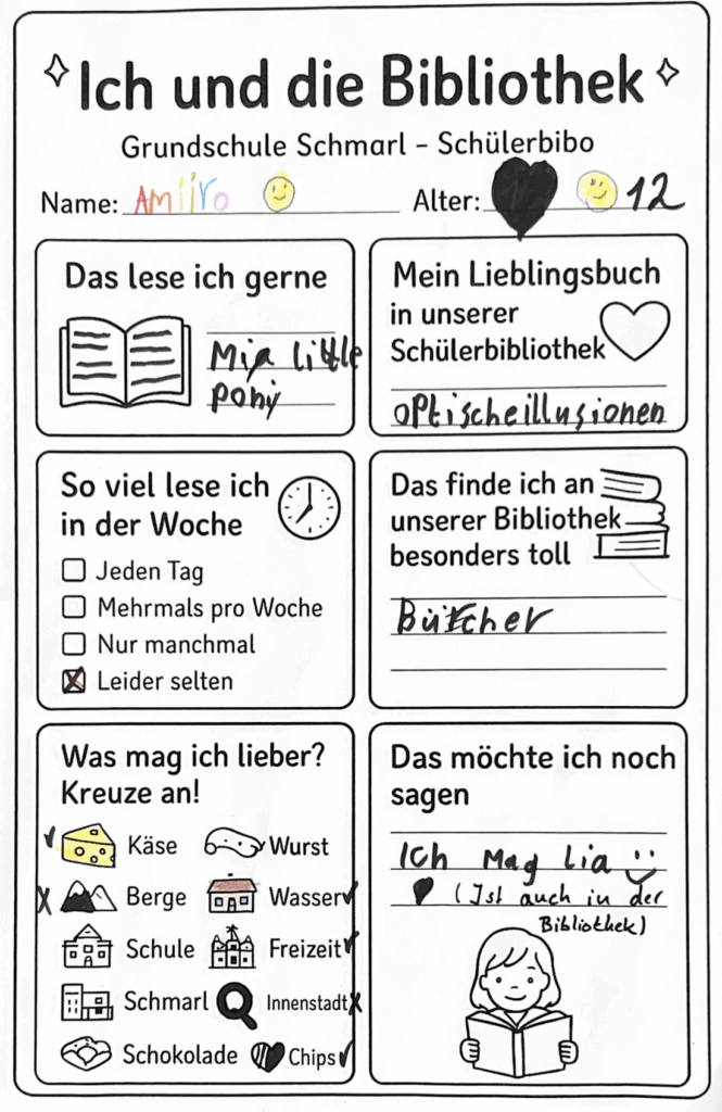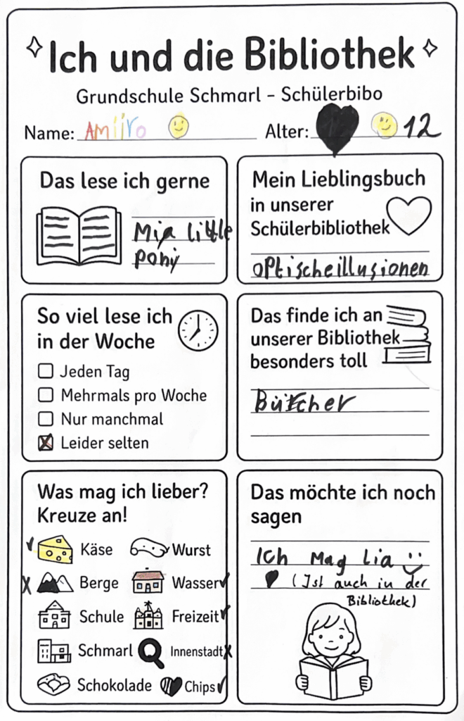 Sie ist immer in der zweiten Hofpause geöffnet und lädt alle Kinder herzlich dazu ein, vorbeizukommen, zu stöbern und in die Welt der Geschichten einzutauchen.